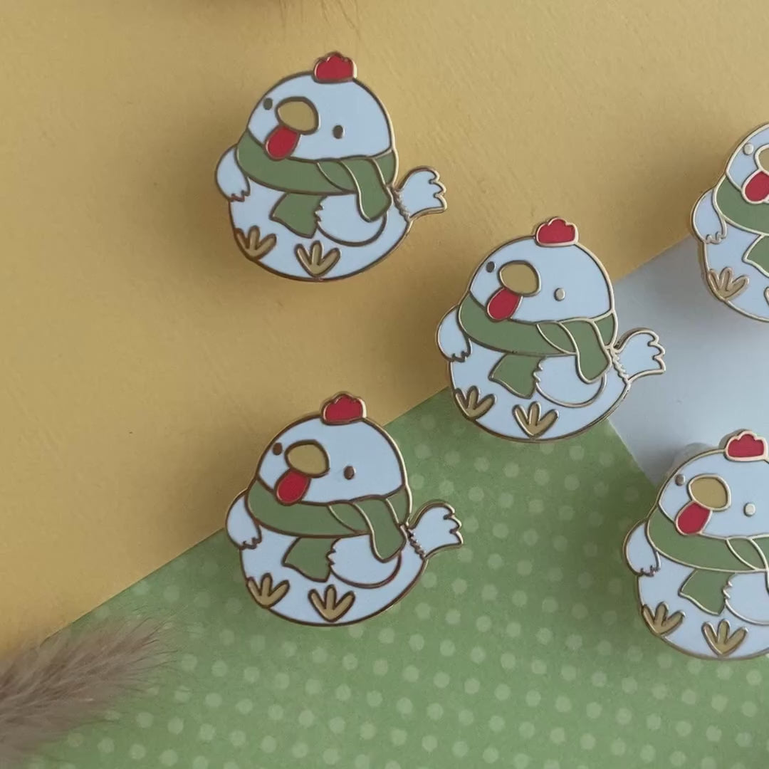 Get ready for the fall season with this cozy white chicken enamel pin, complete with a stylish mint scarf! Add it to your hat, backpack, jacket, or wherever you'd like for a quirky and playful touch. The perfect gift for any chicken lovers!