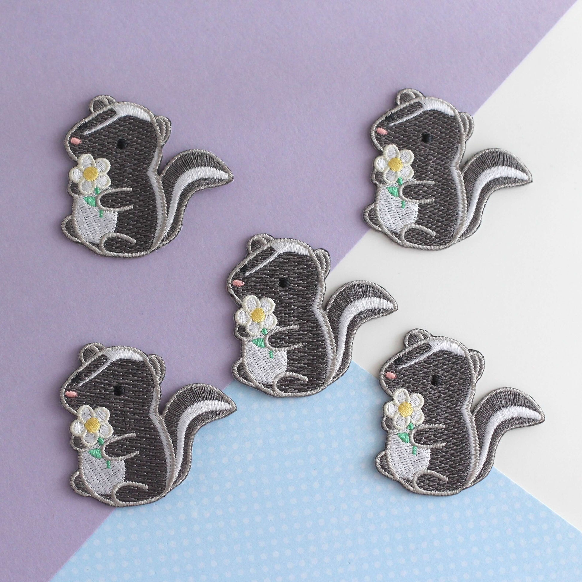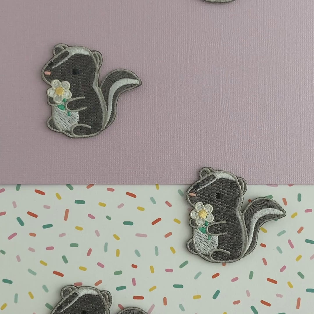 Add a touch of cuteness to your clothing with this skunk holding a daisy embroidered iron-on patch! This patch is perfect for anyone looking for a unique and whimsical addition to their wardrobe. Simply iron on and make your jacket, jeans, or tote bag even more adorable!